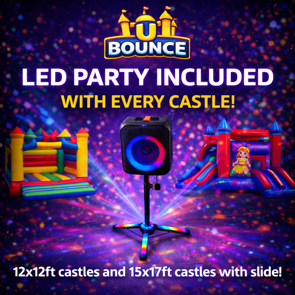 Large combo inflatables with slide and disco features for extra party fun. includes disco lights and tripod speaker.